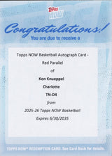 2025 Topps Now Kon Knueppel #D4 Red Auto Redemption /5 Charlotte Hornets Rookie RC Basketball Card