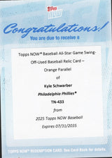 2025 Topps Now Kyle Schwarber #433 Orange All-Star Game Swing Off Relic /25 Redemption Philadelphia Phillies Baseball Card