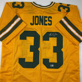 Autographed/Signed Aaron Jones Green Bay Yellow Football Jersey Beckett BAS COA
