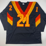 Jersey has no brand names or logos. This is a custom jersey and was not manufactured by or in any manner associated with any professional sports league or manufacturer. This custom jersey carries no professional sports league designation. The item is intended to be an autographed collectible. The custom jersey displays the name and number of the player. This item in no way is affiliated with or connected to any professional sports organization. Size is XL.