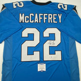 Autographed/Signed Christian McCaffrey Carolina Blue Football Jersey Beckett BAS COA