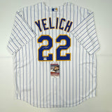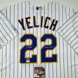 Autographed/Signed Christian Yelich Brew Crew Milwaukee Brewers Pinstripe Cool Base Baseball Jersey JSA COA