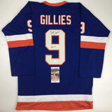 Autographed/Signed Clark Gillies HOF 02 New York Blue Hockey Jersey JSA COA