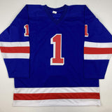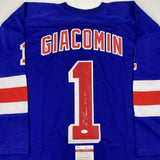Autographed/Signed Eddie Giacomin HOF 87 New York Blue Hockey Jersey JSA COA