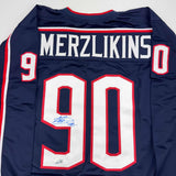 Autographed/Signed Elvis Merzlikins Columbus Blue Hockey Jersey Beckett BAS COA