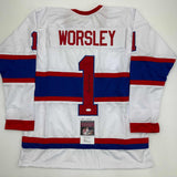 Autographed/Signed Gump Worsley Montreal White Hockey Jersey JSA COA
