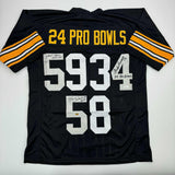 Autographed/Signed Jack Ham, Jack Lambert, and Andy Russell Inscribed "24 Pro Bowls", "HOF 88" & "HOF 90" Pittsburgh Black Football Jersey JSA COA