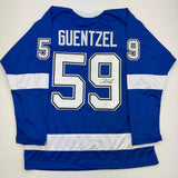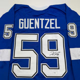 Autographed/Signed Jake Guentzel Tampa Bay Blue Hockey Jersey PSA COA