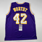 Autographed/Signed James Worthy Los Angeles LA Purple Basketball Jersey JSA COA