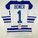 Autographed/Signed Johnny Bower HOF 76 Toronto Blue Hockey Jersey JSA COA