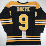 Autographed/Signed Johnny John Bucyk HOF 1981 Boston Black Hockey Jersey JSA COA