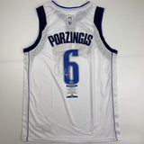 Autographed/Signed Kristaps Porzingis Dallas White Basketball Jersey Beckett BAS COA