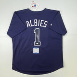 Autographed/Signed Ozzie Albies Atlanta Braves Blue Majestic Baseball Jersey Beckett BAS COA