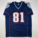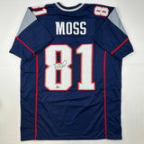 Autographed/Signed Randy Moss New England Blue Football Jersey Beckett BAS COA