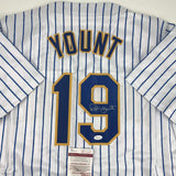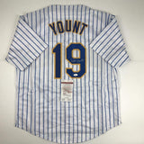 Autographed/Signed Robin Yount Milwaukee Pinstripe Baseball Jersey JSA COA