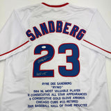 Autographed/Signed Ryne Sandberg HOF 05 Chicago White Pinstripe Stat Baseball Jersey JSA COA