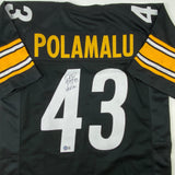 Autographed/Signed Troy Polamalu HOF 20 Pittsburgh Black Football Jersey Beckett BAS COA