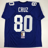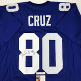 Autographed/Signed Victor Cruz New York Blue Football Jersey JSA COA