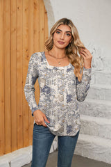 This blouse features a printed striped pattern with a refined, classic design. It has a square neckline and regular length with long, standard sleeves. Made from 95% polyester and 5% elastane, the fabric offers slight stretch for comfort. The opaque material ensures modesty, and care is simple with machine wash cold and tumble dry low.