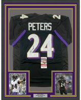 Framed Autographed/Signed Marcus Peters 35x39 Baltimore Black Football Jersey JSA COA
