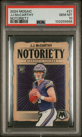 Graded 2024 Panini Mosaic JJ McCarthy #21 Notoriety Rookie RC Football Card PSA 10 Gem Mint
