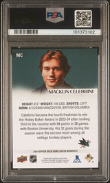 Graded 2024 Upper Deck Macklin Celebrini #MC Game Dated Moments Rookie RC Hockey Card PSA 10 Gem Mint
