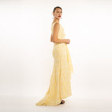 Indulge in the luxurious elegance of our One Shoulder Origami Overlay Gown. The exquisite floral burnout brocade is complimented by an origami folded overlay, adding a sophisticated touch. The side front slit adds sensuality to this stunning piece. Elevate your style with this exclusive gown.