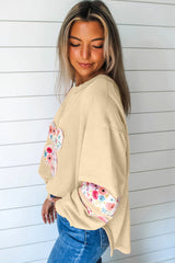 Pale Khaki Flower Applique Patchwork Drop Sleeve Pullover Sweatshirt