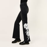 Our premium stone wash black denim combined with a bold screen print placement white flower at the side of the leg, make this bootcut create a statement like no other.
