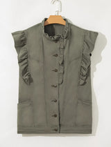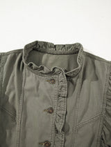 This playful patchwork denim jacket vest is a delightful twist on a classic, featuring button closures and flirty ruffled accents that add a lively charm to your outfit.