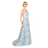 Multicolored floral embroidery adds a captivating dimension to this classic lace dress. Featuring a dusty blue material, one-shoulder design and a figure-hugging fit. Pair it with strappy heels and an elegant clutch to complete the look.