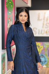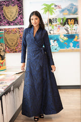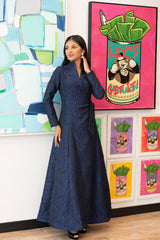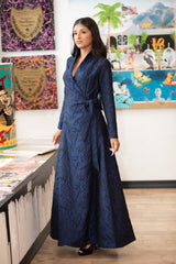 Indulge in timeless elegance with The Penninsula. This regal wrap gown boasts a stylish funnel neck and is made from an exquisite navy/black brocade. Its luxurious fabric and classic design exude sophistication and opulence, making it a must-have for any discerning fashionista. Elevate your wardrobe with The Penninsula today.