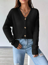 This elegant cardigan showcases a ribbed texture with button-up detailing. Crafted from a blend of 95% acrylic and 5% spandex, it offers a subtle stretch for comfort. Designed for easy care, it can be machine washed in cold water and tumble dried on low heat.